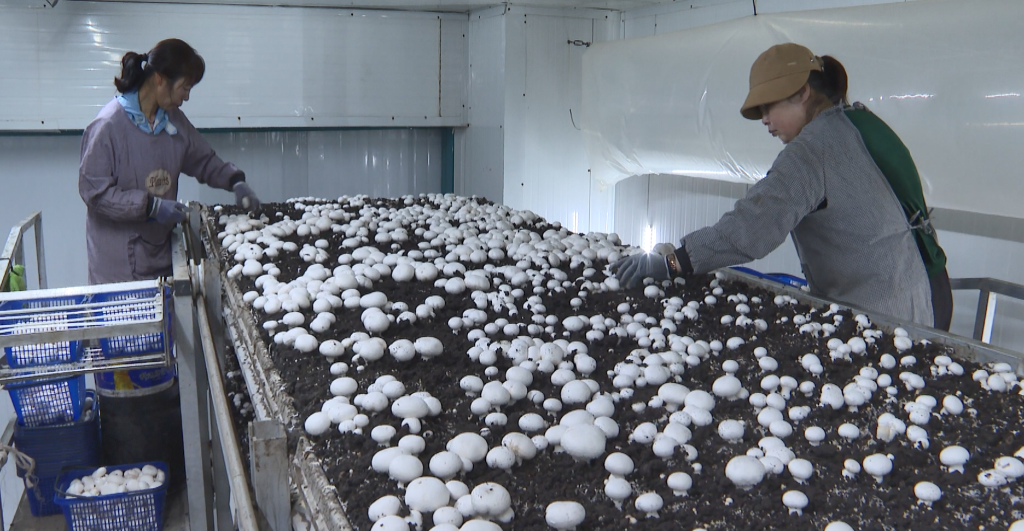 这是在张掖市临泽县食用菌产业园拍摄的工人采摘双孢菇的场景。新华社发