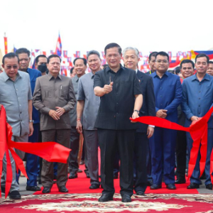 4月12日,在柬埔寨特本克蒙,柬埔寨首相洪玛奈(前中)为71C号国家公路通车启用剪彩。新华社发(尼多拉摄)