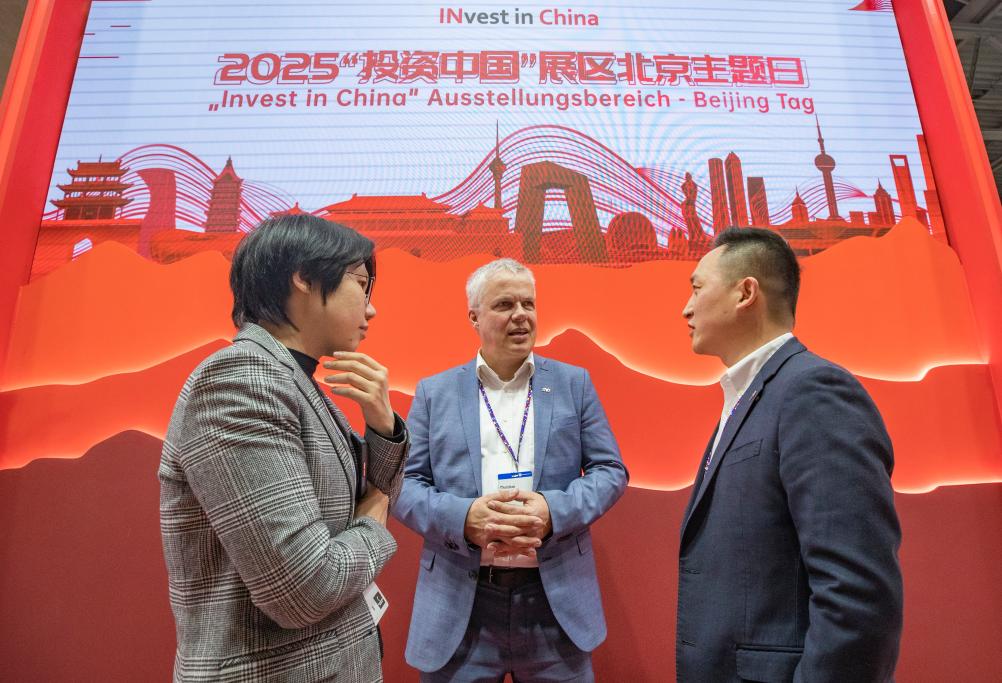 4月1日,在德国汉诺威工业博览会上,人们在“投资中国”展区洽谈。新华社记者 张帆 摄