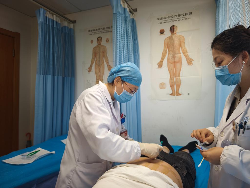安徽省针灸医院内分泌科主任医师费爱华(左)为一位肥胖者开展埋线治疗(4月7日摄)。新华社记者 郭晨 摄