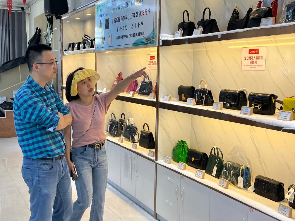 游客在鳄珍鳄鱼园的产品展销区选购鳄鱼皮具。新华社记者 罗江摄