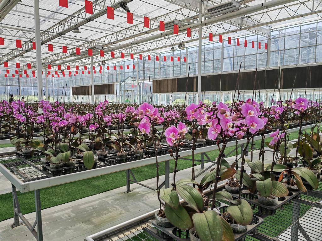 在山东省兰陵县智慧农业产业园的温室大棚内,蝴蝶兰花开正旺。新华社记者刘铮 摄