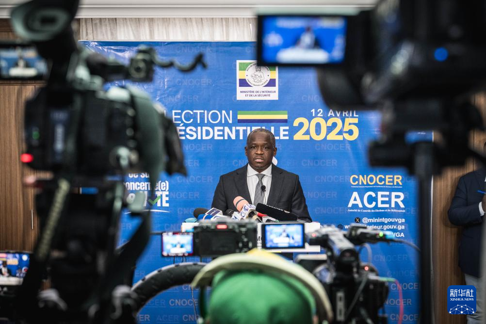 4月13日,加蓬内政和安全部长埃尔曼·伊蒙戈在加蓬利伯维尔的新闻发布会上讲话。新华社记者 王冠森 摄