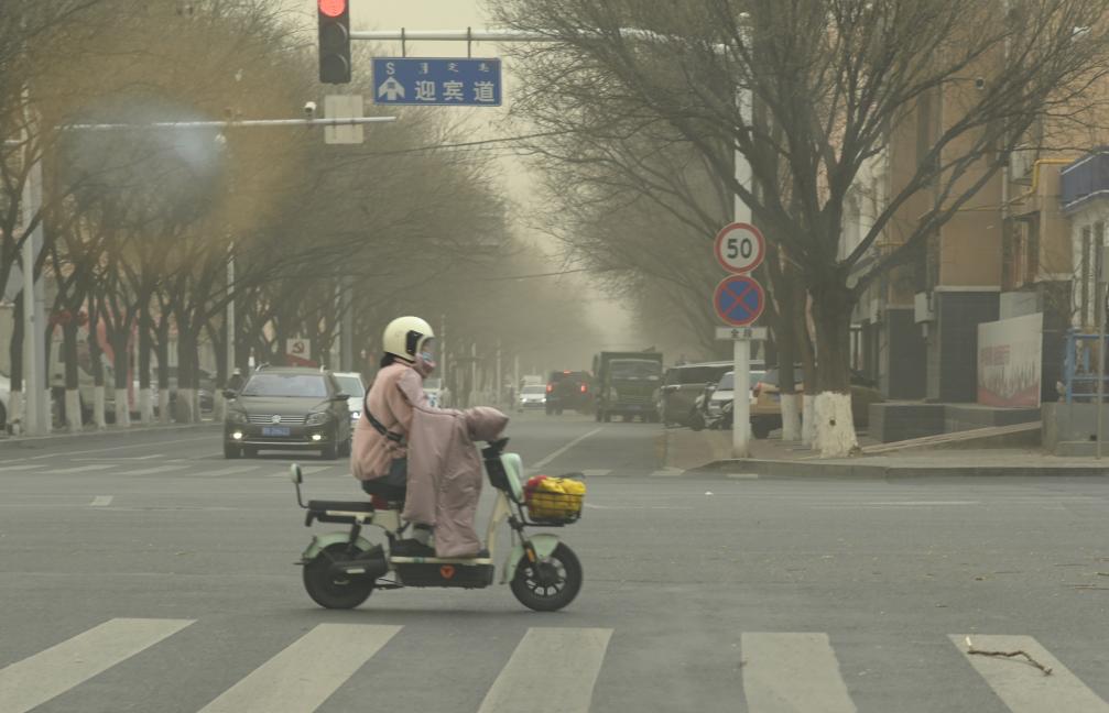 2025年4月11日,在内蒙古包头市街头,市民骑车出行。当日,内蒙古包头市出现大风沙尘天气。新华社记者 贾立君 摄