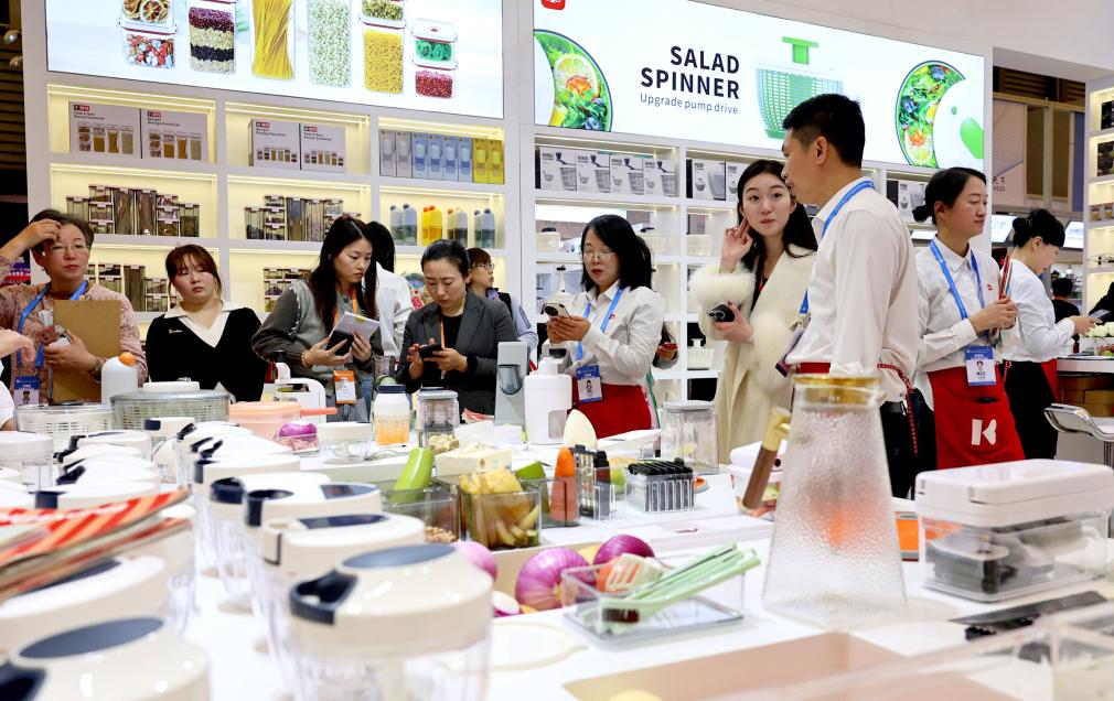 3月1日,第33届华东进出口商品交易会在上海开幕。图为人们在第33届华交会一处家庭用品展位交流。新华社记者 方喆 摄