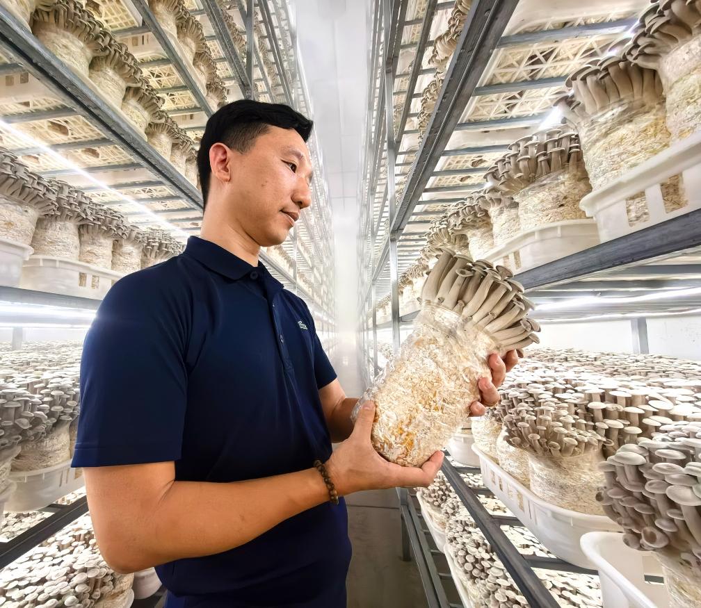 2022年,叶滔怀揣着“菌菇梦”来到广西贵港,和年轻的团队成员一起,用时两年建成了年产5万吨的食用菌工厂化生产基地。不同于传统的菌棒种植,基地采用液体菌种制种、工厂化立体式栽培等技术,每天可接种25万瓶液体菌种。10层高的出菇房内,一天就能采收130吨食用菌,效率比传统种植提升超10倍。