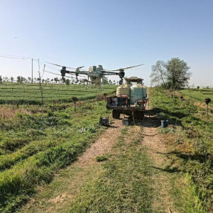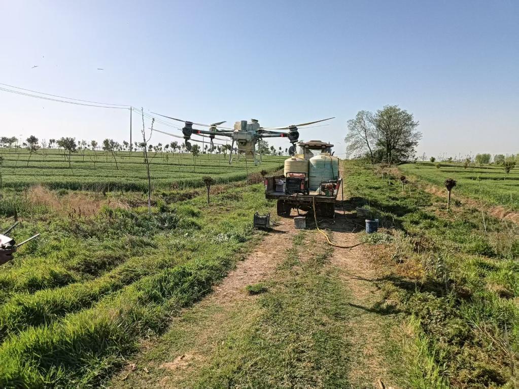 4月14日,安徽太禾林业开发有限公司飞手正在对碧根果树进行无人机打药。新华社发(周先健摄)