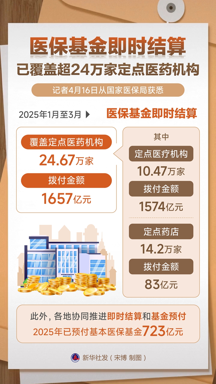新华社北京4月16日电(记者徐鹏航)记者16日从国家医保局获悉,今年1月至3月,医保基金即时结算覆盖定点医药机构24.67万家,拨付金额1657亿元。