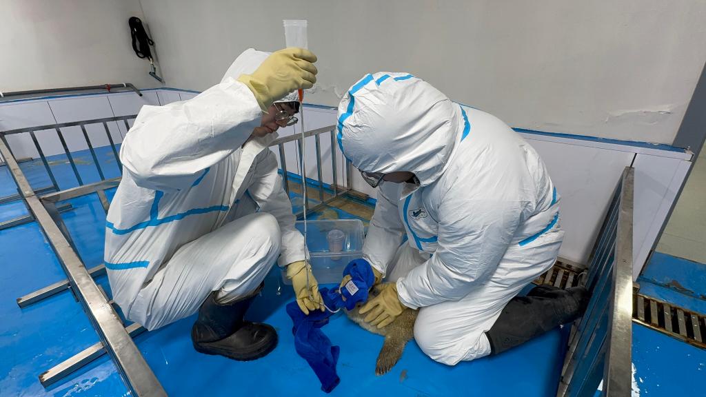 “刚来时,它身上容易吸水的白色胎毛还没褪,我们判断它出生不久就与母亲失散,吃到母乳的天数不多。加上不知道在海上漂泊或在海边流浪了多久,它身体极度虚弱,不具备自主进食能力,我们只能通过下胃管、喂鱼浆的方式辅助它进食。”海科院海洋珍稀动物保护研究室主任田甲申回忆说。