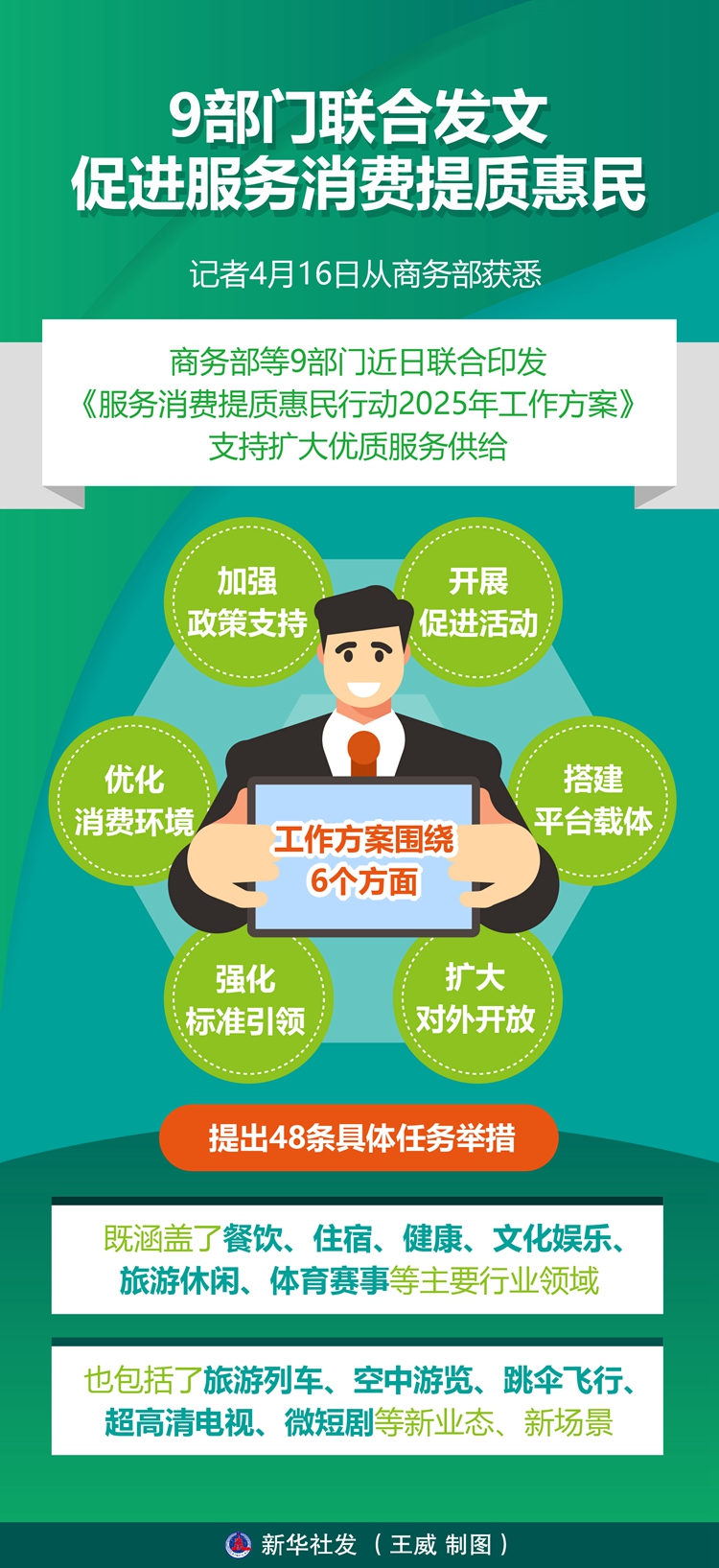 新华社北京4月16日电(记者谢希瑶、王雨萧)记者16日从商务部获悉,商务部等9部门近日联合印发《服务消费提质惠民行动2025年工作方案》,支持扩大优质服务供给。