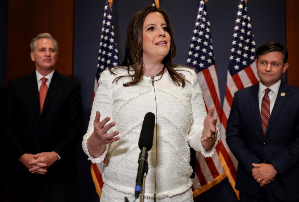 2021年5月14日,美国纽约州共和党籍联邦众议员爱丽丝·斯蒂芬尼克在华盛顿国会山向记者讲话。新华社/路透