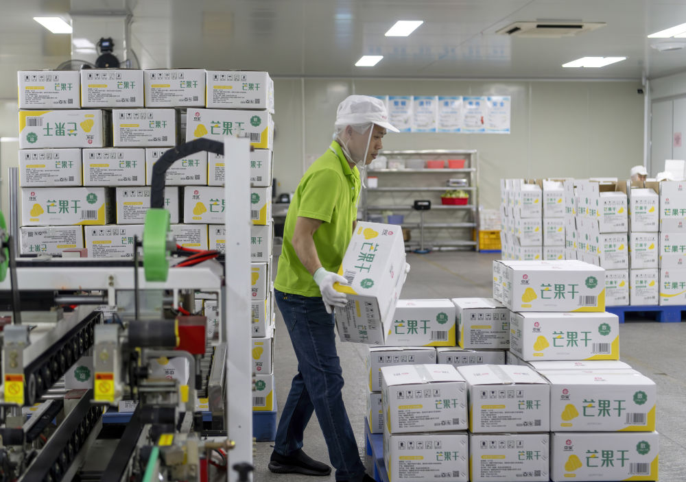 ↑在福建漳州的中宝(福建)食品科技有限公司食品加工生产线,工人搬运成箱的芒果干。