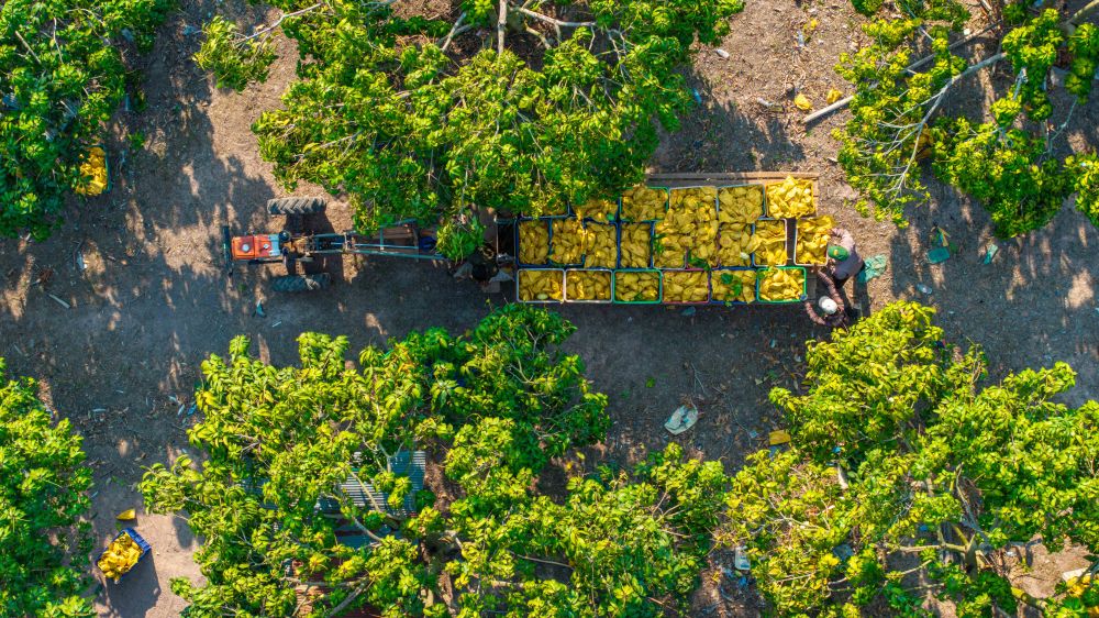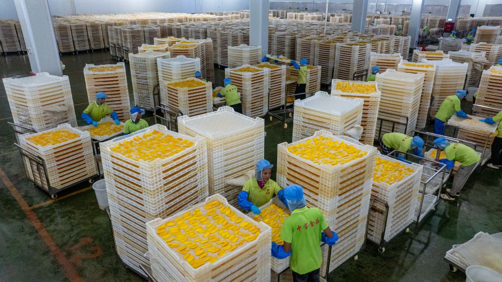 工人们忙着将鲜芒果采摘、装车,运送到附近的芒果干加工厂,经过清洗、削皮、切片、糖渍、烘干等工序,变成了一片片香甜柔韧的芒果干。