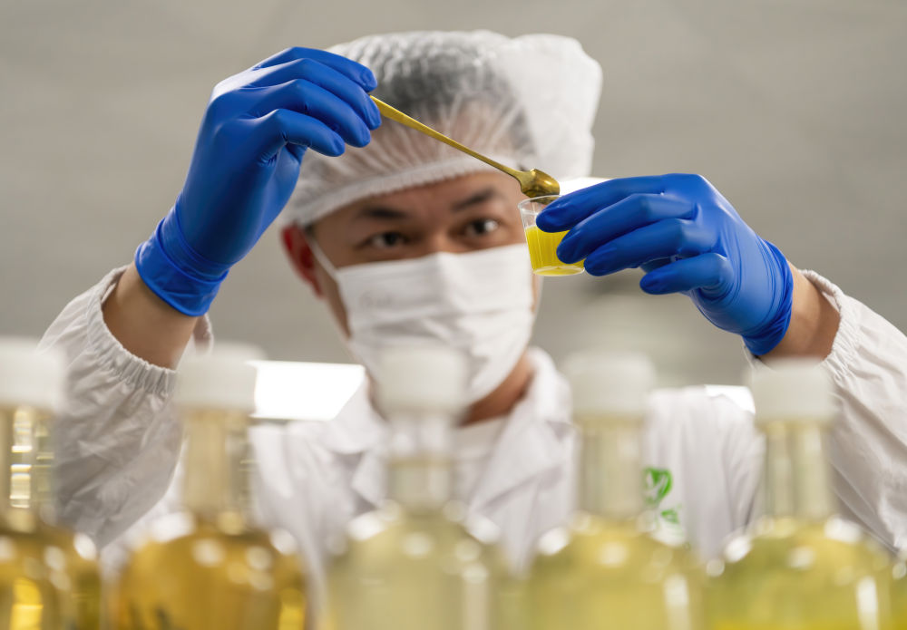 ↑在福建漳州的中宝(福建)食品科技有限公司技术中心,技术人员检验芒果饮料。