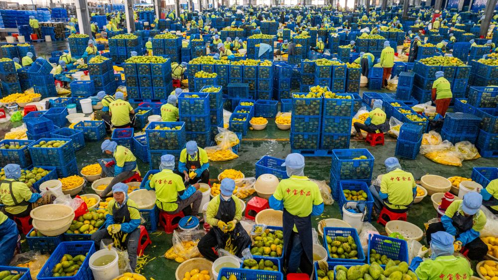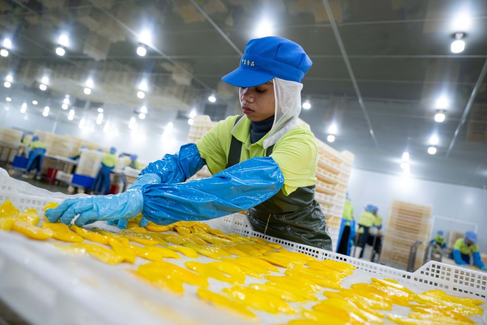 ↑在福建漳州的中宝(福建)食品科技有限公司食品加工生产线,工人挑选来自柬埔寨的芒果干。