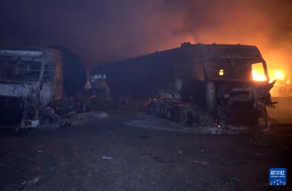 4月17日,在也门荷台达省伊萨角港,遭美军空袭的车辆燃起大火(视频截图)。新华社发