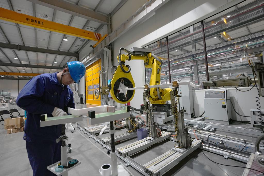 2月26日,在哈尔滨电机厂有限责任公司线圈分厂智能制造车间,工人与智能设备在进行协同加工生产作业。新华社记者 王松 摄