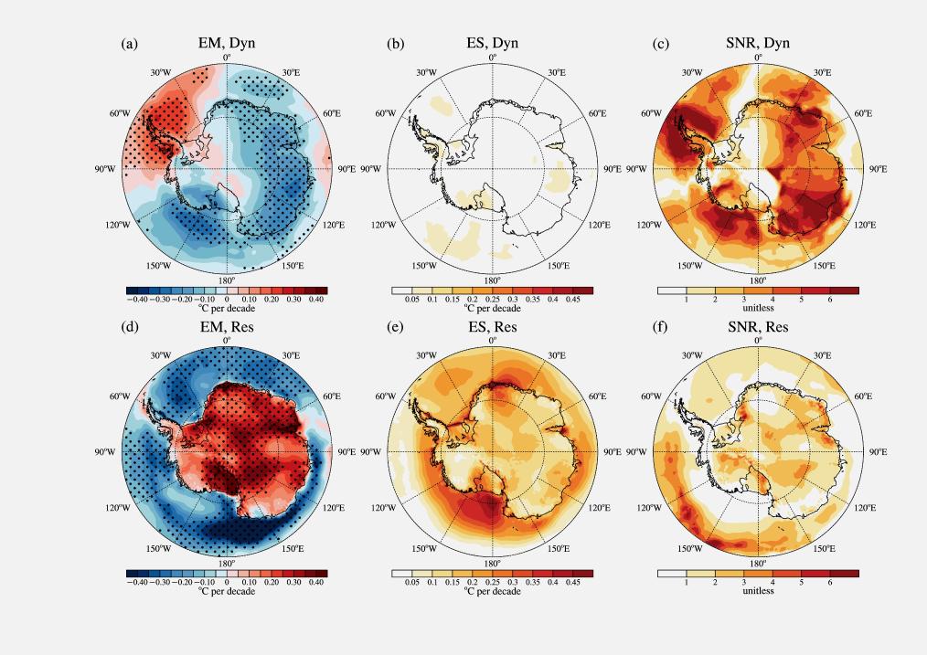 丁明虎研究团队定量评估了这两种物理过程对南极地区气温变化的贡献。结果表明,“热力过程”是驱动南极增温的主导因素,贡献约为每10年0.22摄氏度的升温效应;而“动力过程”则导致南极大陆整体以每10年0.10摄氏度的速率降温,部分抵消了热力增温的效应。