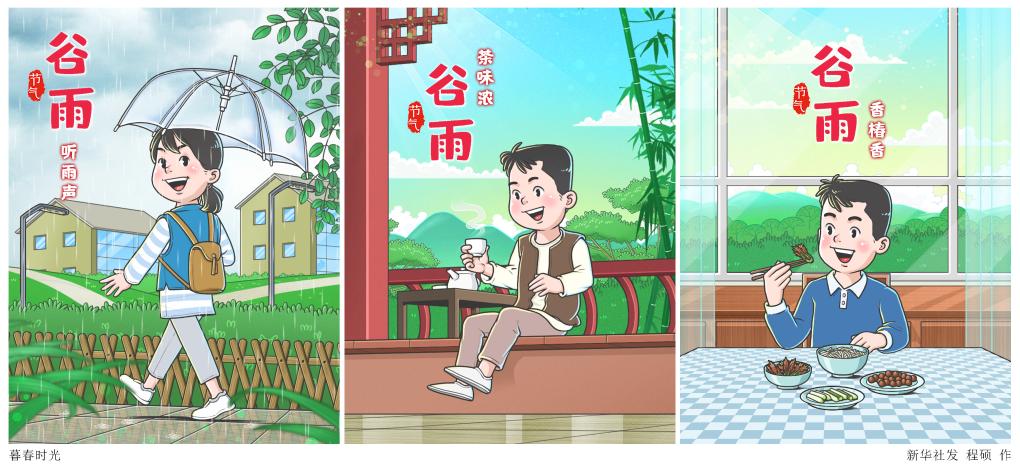 “根据中医理论,谷雨时节正是脾气旺于春季之时,是调补脾胃的好时机。”蒋跃绒说,这一时期饮食以“清淡、柔肝、健脾、适量”为宜,可适当食用梅类、山楂等味酸食物以柔肝疏肝,选择山药、茯苓、白术、白扁豆等健脾食物熬粥、炖汤食用以健脾培中;在气温回升较快的地区可适当食用苦味菜以清心去火;还可饮用谷雨茶以清火明目,食用香椿以健胃理气、清热解毒。