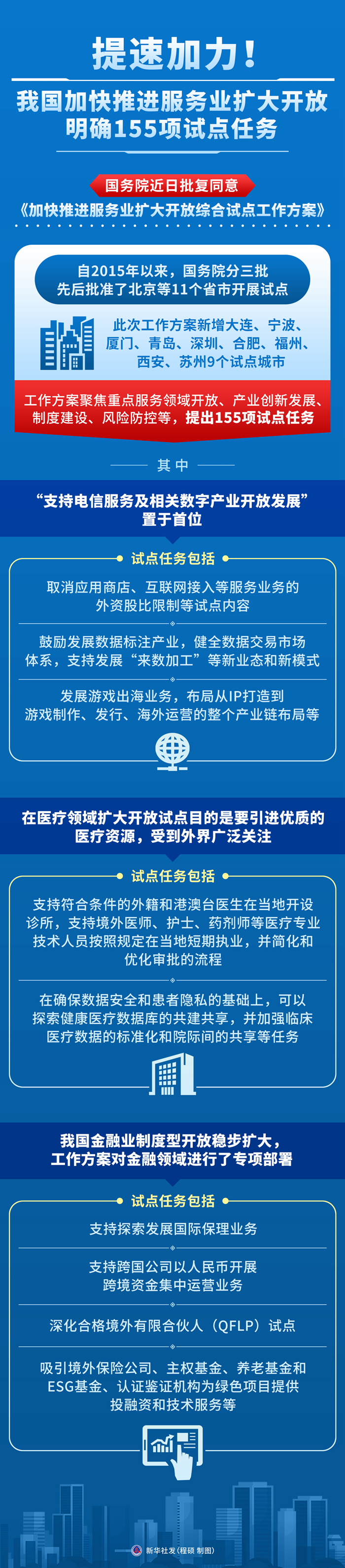 新华社北京4月21日电 题:提速加力!我国加快推进服务业扩大开放明确155项试点任务