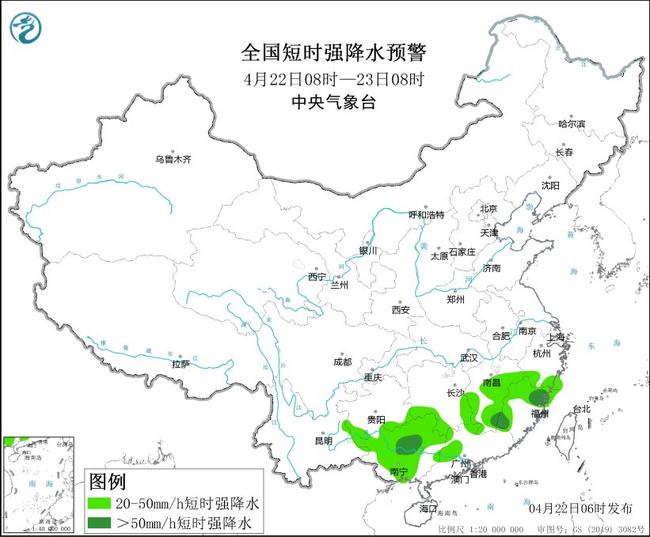 预计4月22日08时至23日08时,江南东部、华南西部等地的部分地区将有8级以上雷暴大风或冰雹天气,其中,广西西部和东北部等地的部分地区将有10级以上雷暴大风;江南东部、华南西部等地的部分地区将有小时雨量大于20毫米的短时强降水天气,其中,江西南部、福建西部和东北部、广西中部等地的部分地区小时雨量大于50毫米,最大可达70毫米以上。