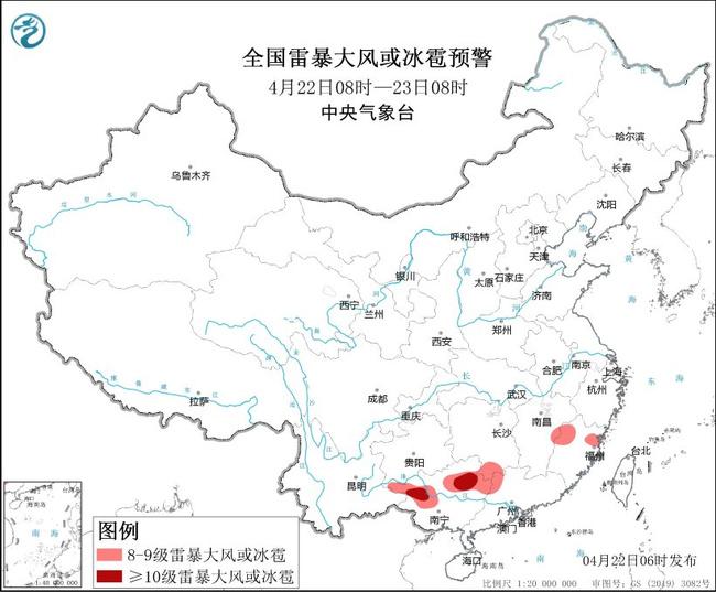 中央气象台4月22日06时继续发布强对流天气蓝色预警: