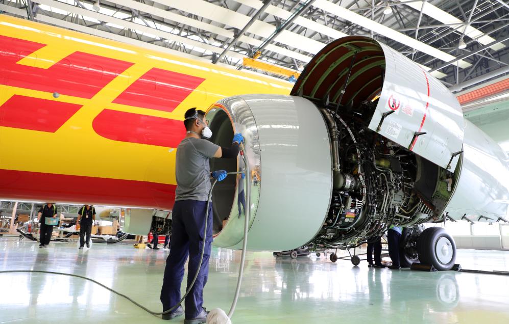 天津海特飞机工程有限公司工作人员在机库内进行维修作业。新华社记者赵子硕摄