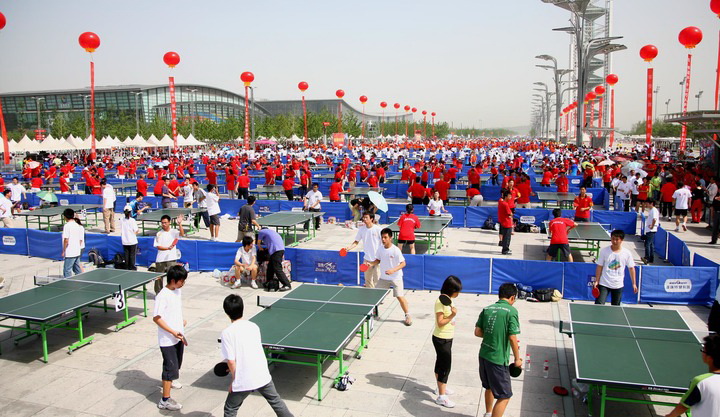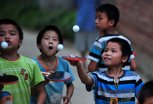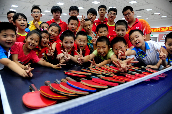 ↑2014年7月16日,孩子们在沈阳市全民健身中心乒乓球台合影。新华社发(张文魁摄)