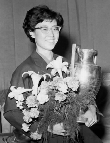 ↑1961年,在第26届世界乒乓球锦标赛女子单打决赛中,邱钟惠战胜匈牙利名将高基安,获得冠军,成为中国第一位女子世界冠军。新华社发(资料照片)