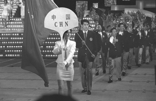 ↑1995年5月1日,第43届世界乒乓球锦标赛开幕式在天津体育馆隆重举行。这是中国代表队高举国旗步入会场。新华社发(资料照片)
