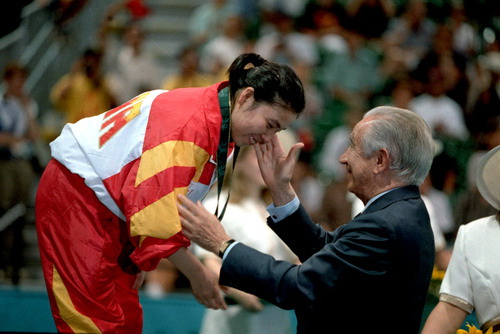 ↑1996年7月31日,邓亚萍获得第26届亚特兰大奥运会乒乓球女子单打金牌后,时任国际奥委会主席萨马兰奇亲自为她颁奖。邓亚萍1989年至1997年间,共获得18个世界冠军、4项奥运会冠军。新华社发(资料照片)