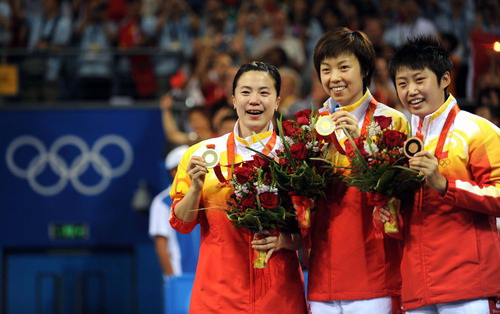 ↑2008年8月22日,获得北京奥运会女单前三名的中国选手张怡宁(中)、王楠(左)和郭跃在领奖台上。新华社发(资料照片)