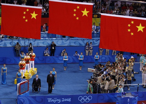 ↑2008年8月23日,三面五星红旗在北京大学体育馆升起,中国选手马琳、王皓、王励勤在北京奥运会乒乓球男子单打比赛中分获金、银、铜牌。新华社发(资料照片)