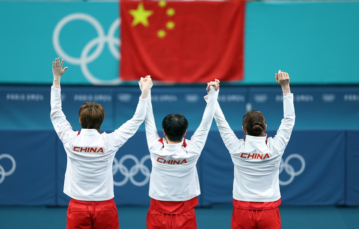 ↑2024年8月10日,冠军中国队选手王曼昱、孙颖莎、陈梦(从左至右)在巴黎奥运会乒乓球女子团体比赛颁奖仪式上。新华社记者 刘续 摄