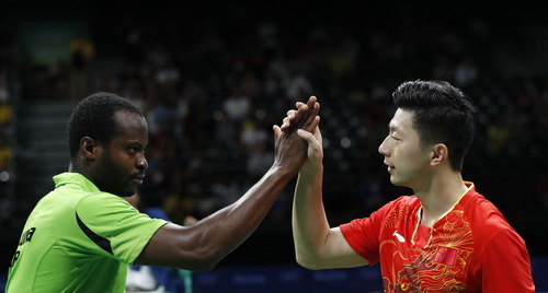 ↑2016年8月9日,尼日利亚选手阿鲁纳(左)赛后与对手马龙击掌致意。当日,在2016年里约奥运会乒乓球男子单打比赛中,阿鲁纳以0比4不敌中国选手马龙,止步八强赛。这是非洲运动员首次打入奥运会乒乓球八强赛。新华社记者沈伯韩摄