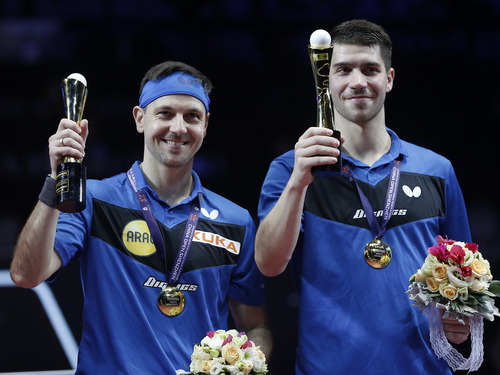 ↑2019年6月1日,德国组合波尔(左)/弗朗西斯卡在深圳进行的国际乒联世界巡回赛2019中国乒乓球公开赛男双决赛中,战胜中国组合马龙/王楚钦,夺得冠军。新华社记者王东震摄