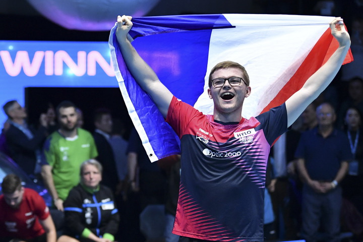 ↑2025年2月23日,在瑞士蒙特勒举行的欧洲16强杯乒乓球赛男子单打决赛中,法国选手艾利克斯·勒布伦斯洛文尼亚选手达科·约基奇,夺得冠军。新华社记者 连漪 摄