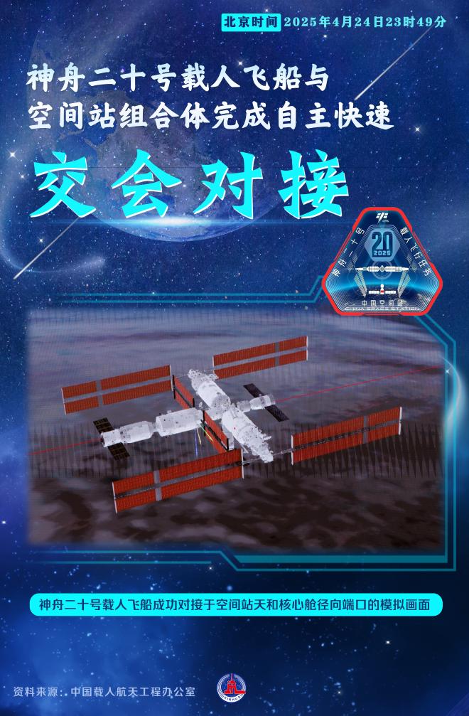 新华社北京4月24日电(记者蔡琳琳)据中国载人航天工程办公室消息,神舟二十号载人飞船入轨后,于北京时间2025年4月24日23时49分,成功对接于空间站天和核心舱径向端口,整个对接过程历时约6.5小时。