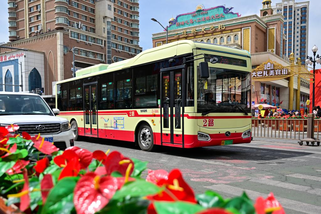 在新疆乌鲁木齐市,“2路印记·城市畅游专线”驶入八楼公交车站(4月22日摄)。新华社记者 丁磊 摄