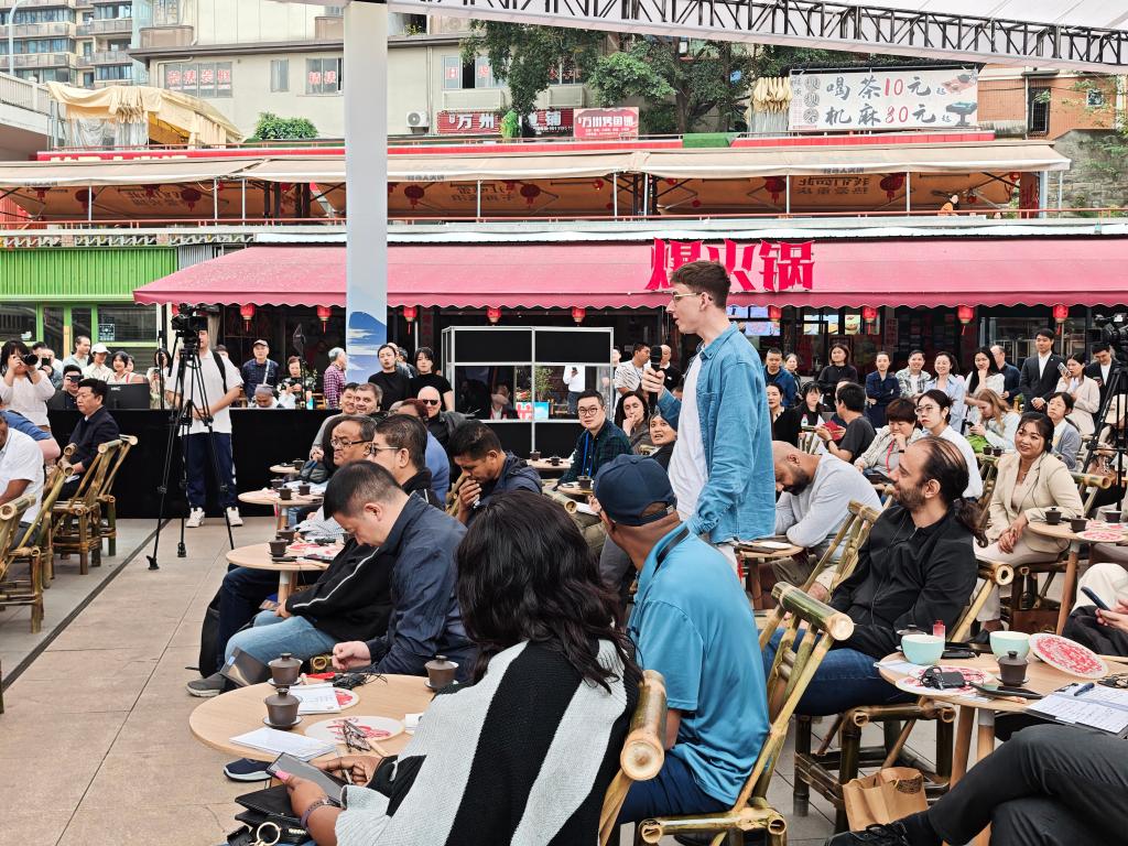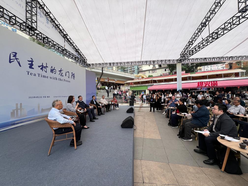 4月22日,外宾在民主村的龙门阵现场提问。新华社记者 陆君钰 摄