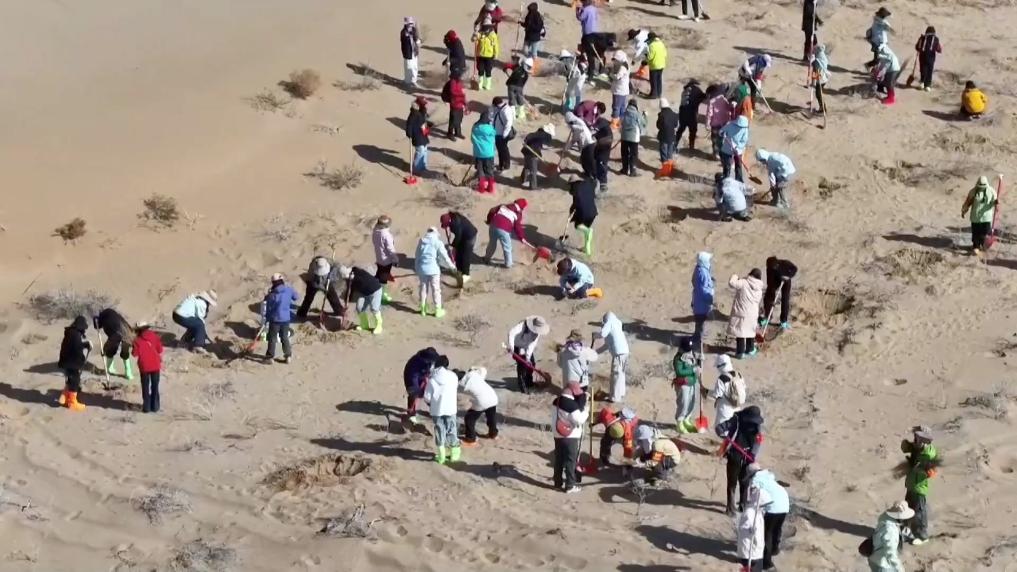 这里是甘肃省武威市民勤县,“请到民勤种棵树”活动今年开展以来,来自全国各地的志愿者已达3万人次,治沙面积达4500余亩,种植梭梭、花棒、柠条等沙生植物150多万棵,在防沙治沙、生态修复方面取得了明显效果。