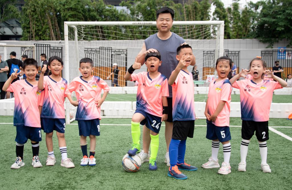↑2024年6月1日,带队老师刘沛和江汉区启慧幼儿园的小球员们在湖北省武汉市江汉区万松园路小学“万超”联赛现场合影。新华社记者 杜子璇 摄