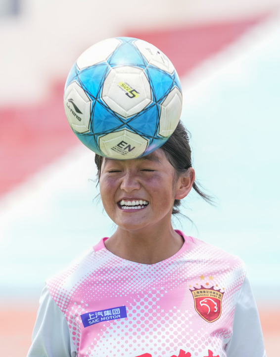 ↑2024年9月3日,在西藏日喀则市上海实验学校操场上,“珠峰雪鹰”女子足球队队员旦增央金在训练头球。新华社记者 丁汀 摄