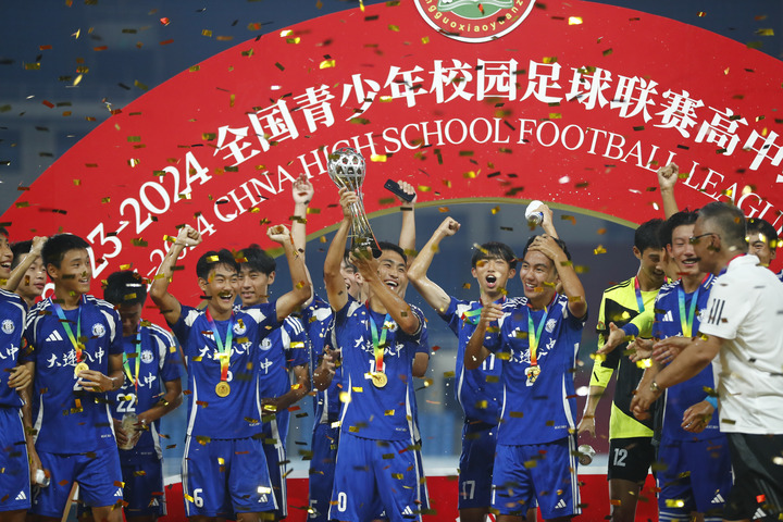 ↑2024年8月30日,大连市第八中学队在颁奖仪式上庆祝。当日,2023-2024全国青少年校园足球联赛高中男子组决赛在北京奥体中心体育场举行,大连市第八中学队2比0战胜南昌市第二中学队,夺得冠军。新华社记者 胡星宇 摄