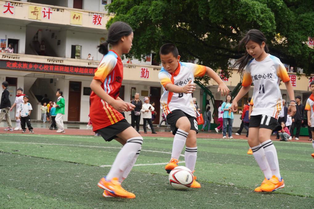 ↑2024年4月12日,学生在贵州省榕江县古州镇第二小学2024年春季学期班级足球超级联赛上表演。新华社发(王炳真 摄)