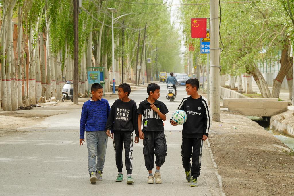 ↑2025年4月13日,在新疆克孜勒苏柯尔克孜自治州阿图什市亚喀巴格村,学生们结束踢球后走在村中小路上。新华社记者 徐宏岩 摄