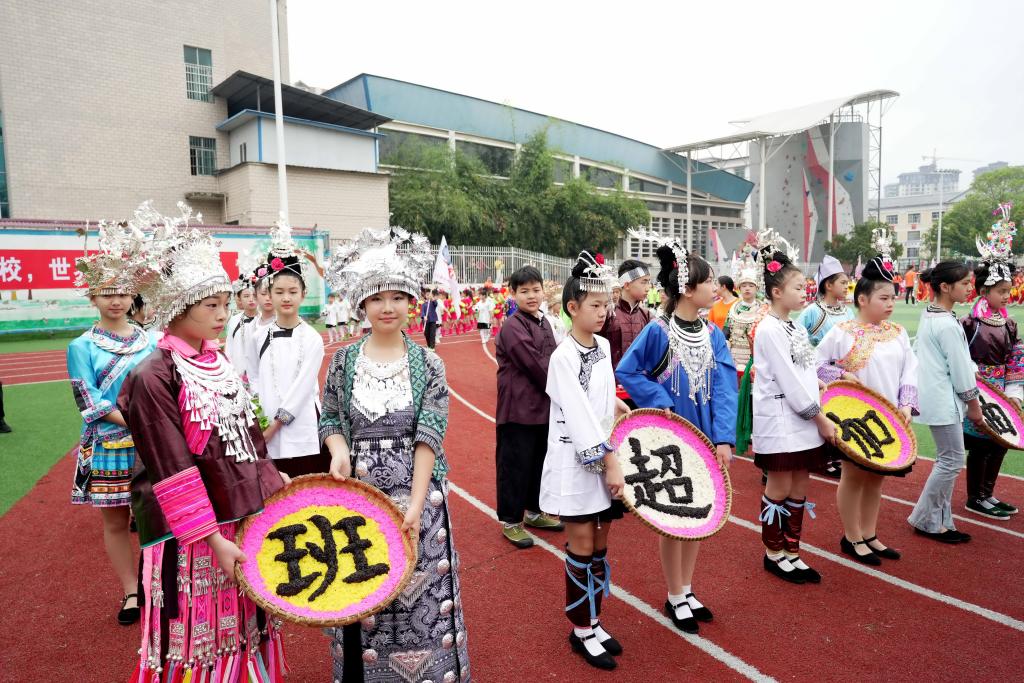 ↑2024年4月12日,贵州省榕江县古州镇第二小学2024年春季学期班级足球超级联赛上,学生美食方阵在入场。新华社发(王炳真 摄)
