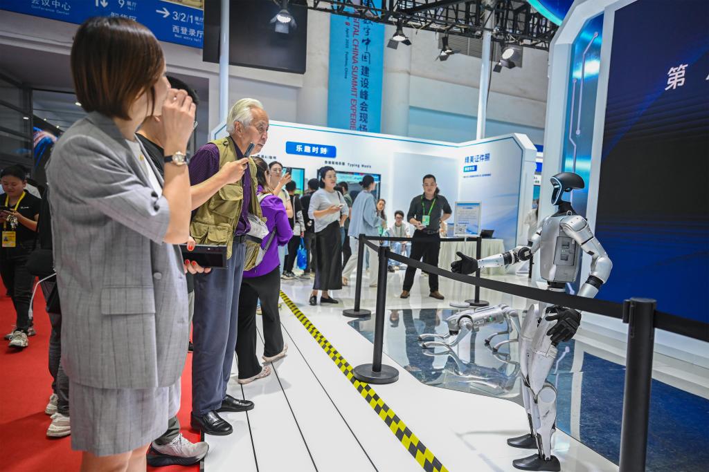 4月28日,观众在第八届数字中国建设峰会现场体验区与机器人互动。新华社记者周义摄