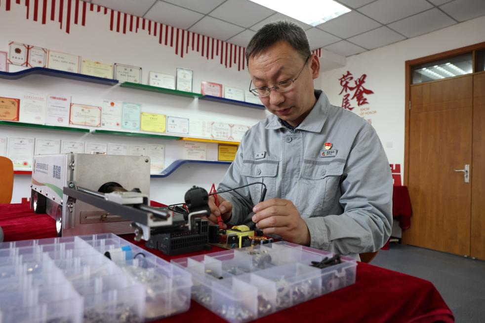 刘伟在创新工作室调试“霹雳鼠”线路板。(受访者供图)