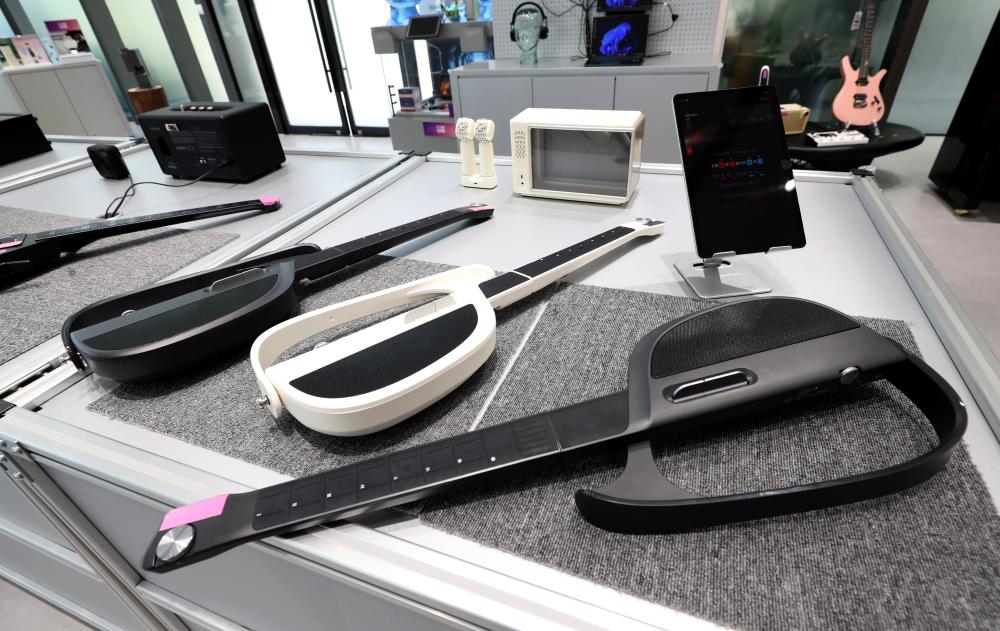 “模速空间”内的人工智能产品体验店展出的智能吉他。新华社记者 方喆 摄